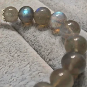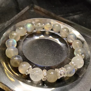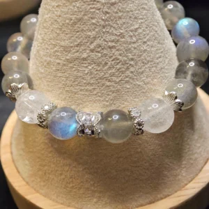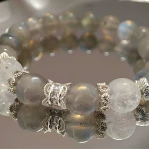 This bracelet serves as a personal energy accessory that helps to clarify thoughts and soothe emotions. It is also designed as a matching set for couples, symbolizing clear communication and tender companionship. The Azeztulite enhances mental clarity and honest expression, while the Gray Moonstone gently calms emotions and increases patience. Together, they foster inner peace and harmonious relationships. It is an ideal gift for couples wishing to enhance understanding and improve communication.
